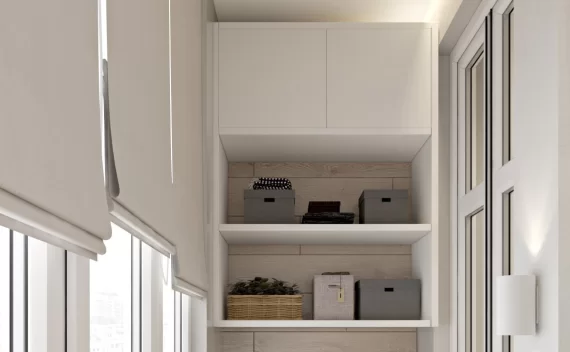 Когда не хватает места для напольной мебели, навесной шкаф — идеальное решение для балкона. Он разгружает пол, не мешает проходу и оставляет пространство для сушилки или кресла. Внутри удобно хранить документы, книги, посуду, бытовую химию и наборы для ухода за растениями. Чтобы пользоваться было действительно удобно, заранее определите высоту секций, глубину полок и направление открывания дверец, учтите створки остекления и высоту подоконника.